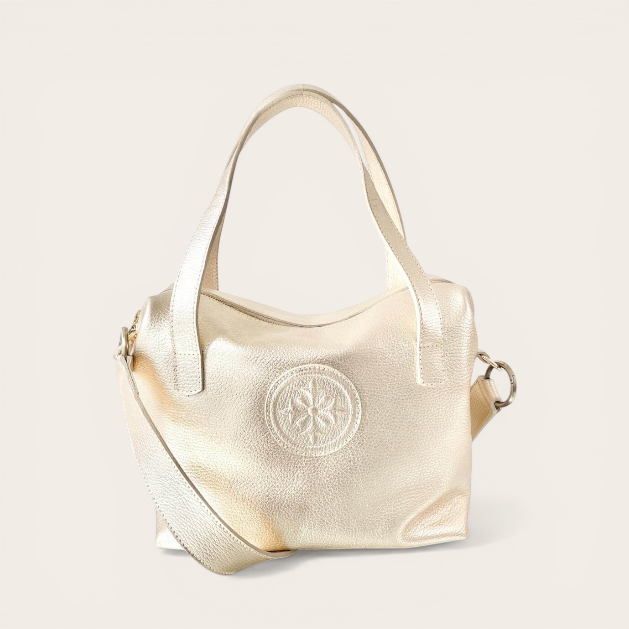 • Cierre superior y bolsillo trasero con cierre metálico dorado