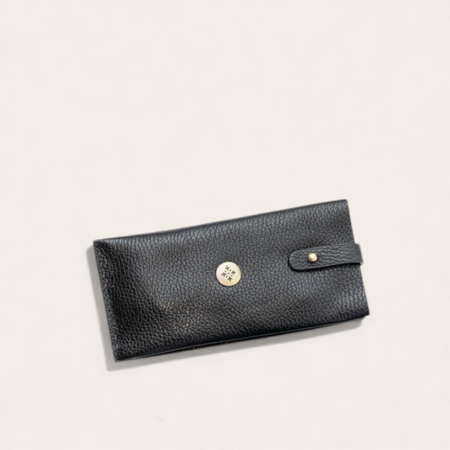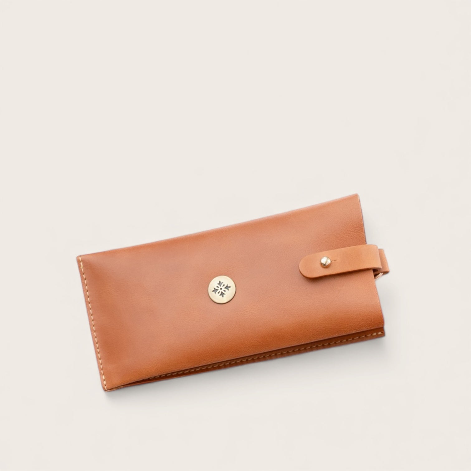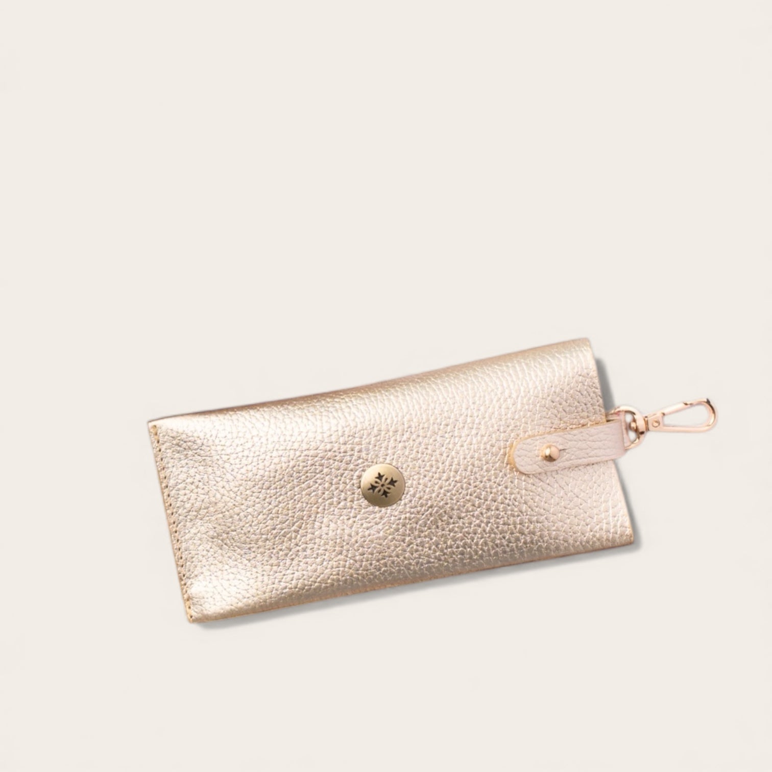 Cómodo estuche para anteojos de Cuero Natural con broche para cerrar y mosquetón para enganchar a tu cartera fácilmente.